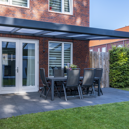 Het robuuste en strakke uiterlijk van deze aluminium overkapping zorgt voor een