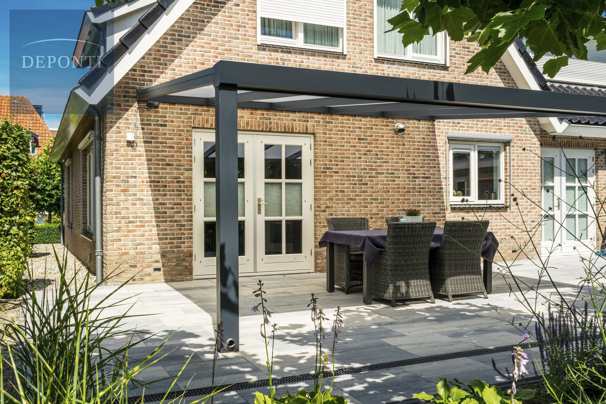 De Deponti Giallo terrasoverkapping is te herkennen aan zijn strakke robuuste uiterlijk en