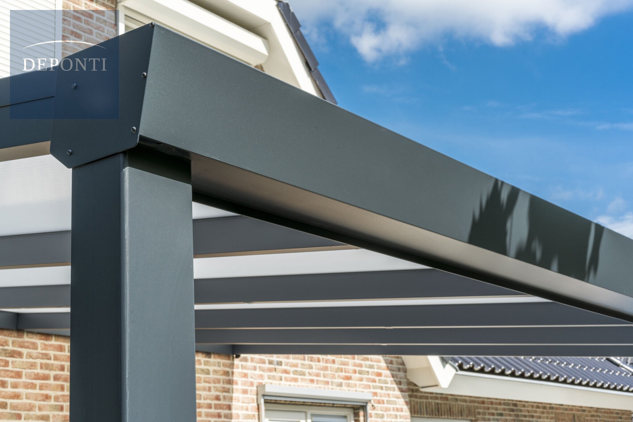 De Deponti Giallo terrasoverkapping is te herkennen aan zijn strakke robuuste uiterlijk en